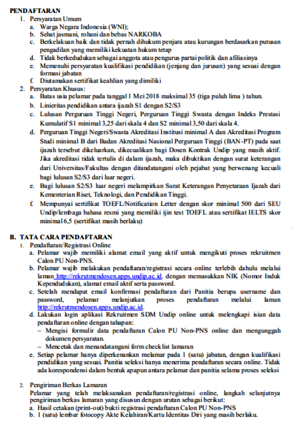 Bahwa untuk memenuhi kebutuhan Dosen tetap Universitas Diponegoro tahun 2018, Universitas Diponegoro mempersembahkan waktu yang sempurna kepada Warga Negara Indonesia untuk mengikuti Seleksi Calon Pegawai Universitas Diponegoro Non Pegawai Negeri Sipil (PU Non-PNS).